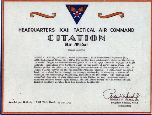 The information on this page about Robert Hunter has been obtained through a possible variety of sources incluging the serviceman themselves, family, copies of military records that are in possession of the Army Air Corps Library and Museum along with data obtained from other researchers and sources including AF Archives at Air Force Historical Research Agency and the U.S. National Archives.